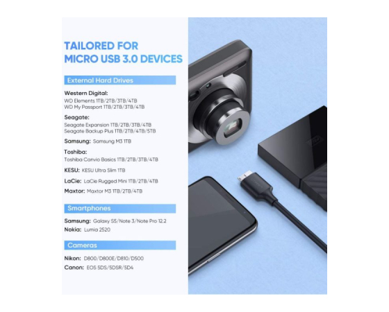 Kabel je idealen za vse, ki imate v lasti trde diske kot so: Seagate Expansion 2TB/Backup Plus, WD My Passport, WD 1TB Elements, Toshiba 3TB Canvio Basics, KESU Ultra Slim, LaCie Rugged Mini, Maxtor M3, Samsung M3 SSD, Integral Portable SSD.