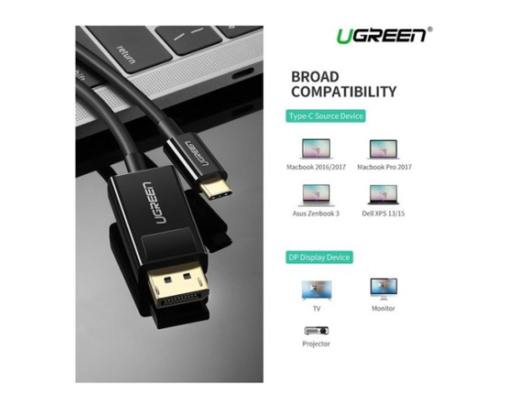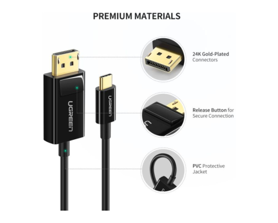 Ugreen kabel USB-C na Displayport omogoča enostavno povezavo z različnimi avdio/video napravami, kot so prenosni računalniki, televizorji, projektorji. Narejen je iz vrhunskih materialov, vključno s sredico iz čistega bakra, pozlačenimi konektorji in visokokakovostnim plastičnim materialom iz ABS plastike za dolgotrajno vzdržljivost.