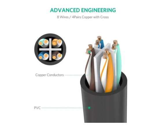 MULTI-SHIELDED Cat6 STANDARD: kabel Ugreen Ethernet ima pozlačen priključek, vrhunsko aluminijasto folijo mylar in bakreno zaščito; 8 žic baker z zaščito s folijo je boljši od bakrene aluminijaste žice (CCA); Ustreza standardu kategorije 6 TIA / EIA 568-C.2.