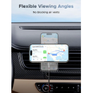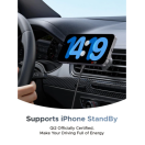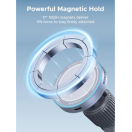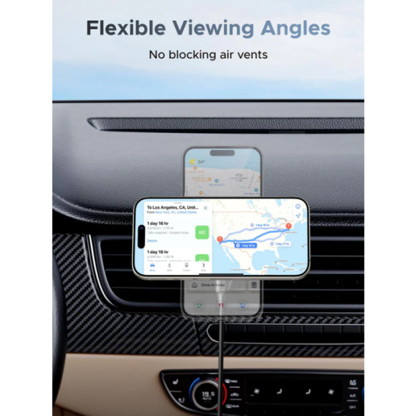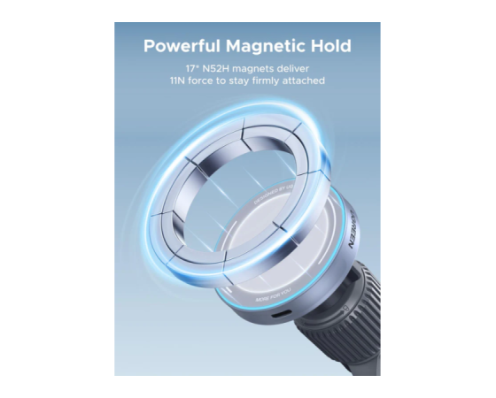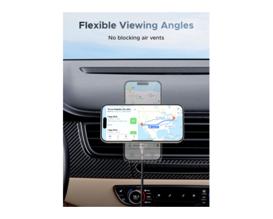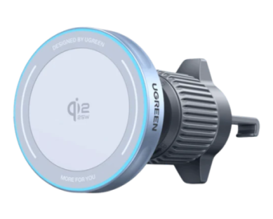 UGREEN 55967 je avtomobilski nosilec in brezžični polnilec, zasnovan za serijo iPhone z magnetno poravnavo. Podpira Qi2 brezžično polnjenje z močjo do 25 W, kar omogoča hitro polnjenje med vožnjo. Vgrajenih je 17 N52 magnetov, ki ustvarijo oprijem do 10 N in zagotavljajo stabilno pritrditev telefona tudi na neravnih cestah. Nastavljiva 360° vrtljiva glava omogoča uporabo telefona v pokončnem ali ležečem položaju za navigacijo, klice ali prikaz informacij. Sistem pritrditve na prezračevalno režo vključuje dodatni kavelj za stabilnost in ne ovira pretoka zraka. Tehnologija ThermalGuard z NTC senzorji spremlja temperaturo in skupaj z več varnostnimi zaščitami preprečuje pregrevanje, prenapetost in druge nepravilnosti med polnjenjem.