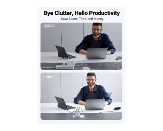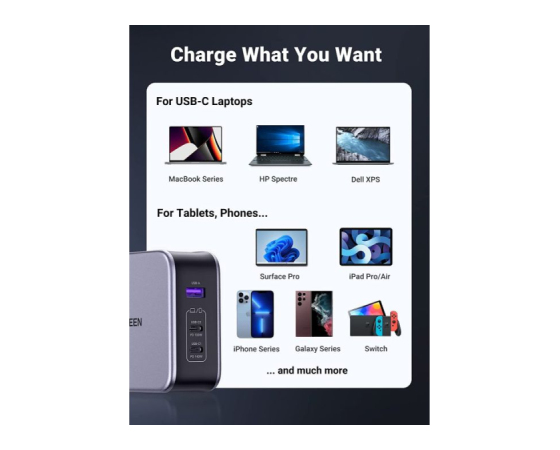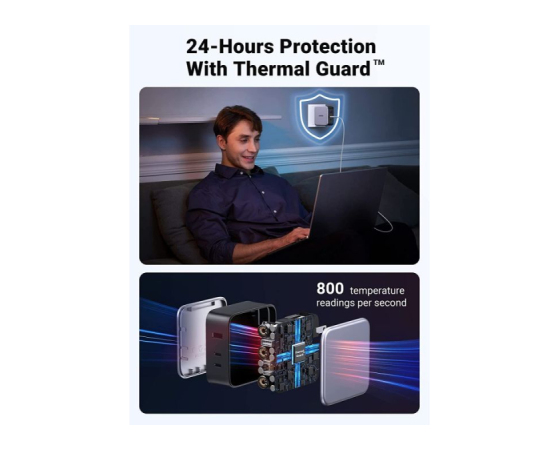 140 W USB C polnilec s tehnologijo Ugreen Thermal Guard Tech in Power Dispenser System zagotavlja varno in brezskrbno izkušnjo polnjenja. Thermal Guard meri temperaturo v realnem času 800-krat na sekundo, da zaščiti vaše naprave pred pregrevanjem; Sistem Power Dispenser inteligentno prilagodi izhodno moč, da zaščiti baterijo vaše naprave in tako dlje zdrži.