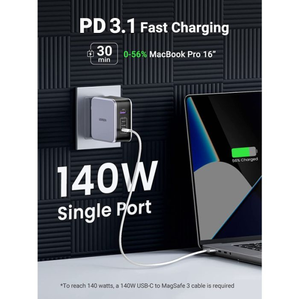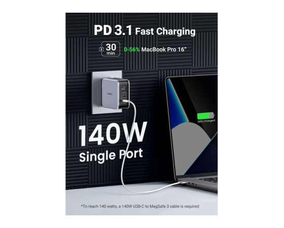 Napajalnik Ugreen 140 W USB C podpira napredno tehnologijo PD 3.1 na vratih C1 in z izhodno napetostjo 28 V lahko ta polnilni adapter Nexode doseže največjo izhodno moč 140 W na vratih C1 za vaše naprave.