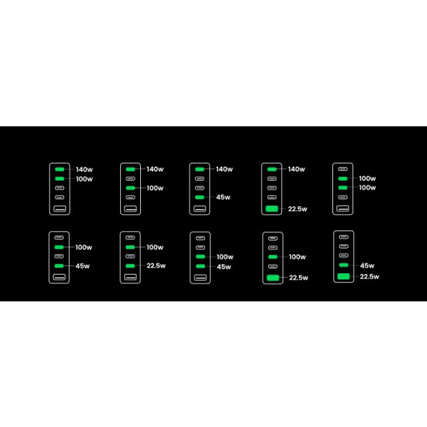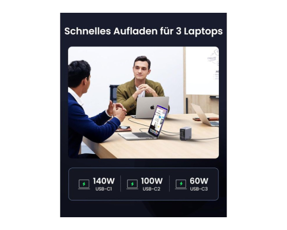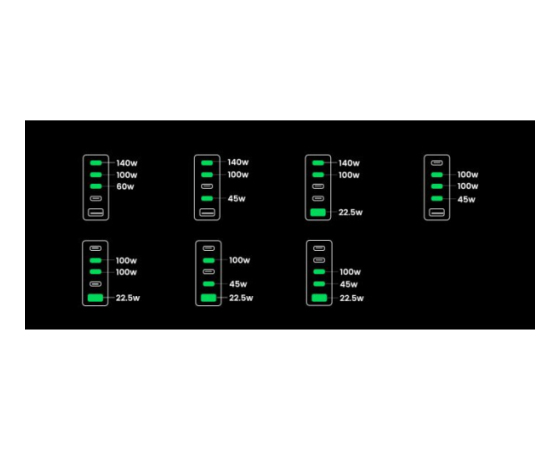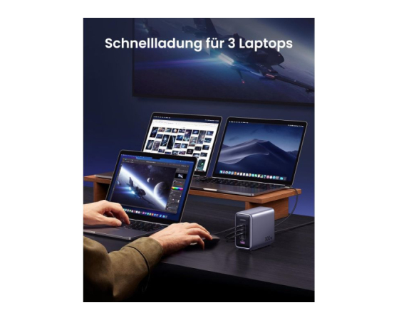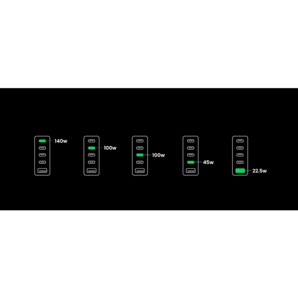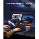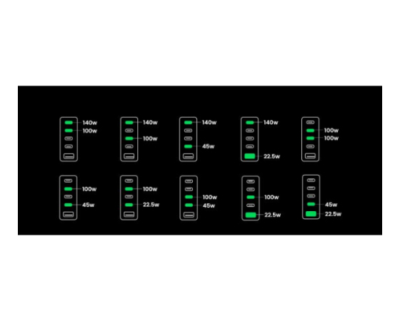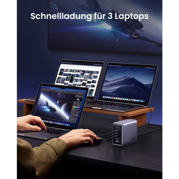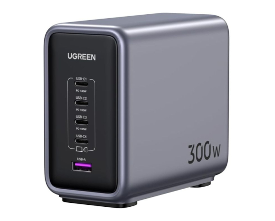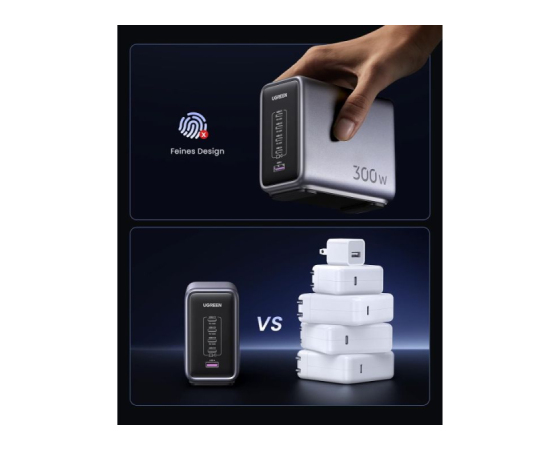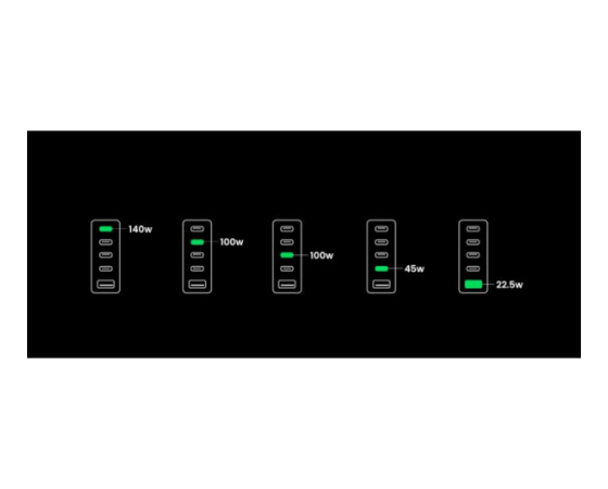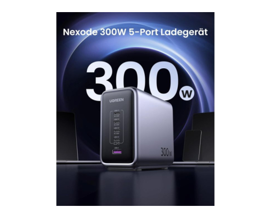 Zahvaljujoč odlični zmogljivosti polnjenja lahko polnilnik GaN napaja 3 prenosne računalnike hkrati. S 4x USB-C in 1x USB-A napajalnik USB C s 300 W hkrati polni 5 naprav, od prenosnih računalnikov do tabličnih računalnikov in pametnih telefonov, zaradi česar ste bolj produktivni v pisarni. Polnilna postaja za vse!