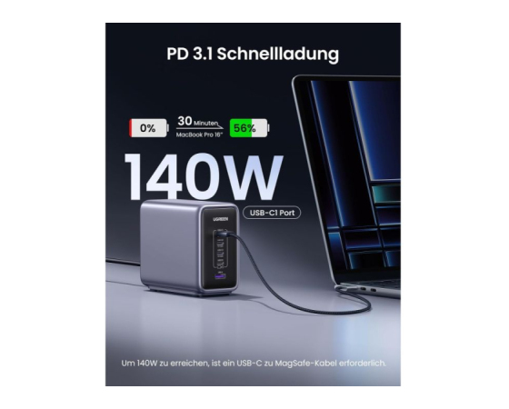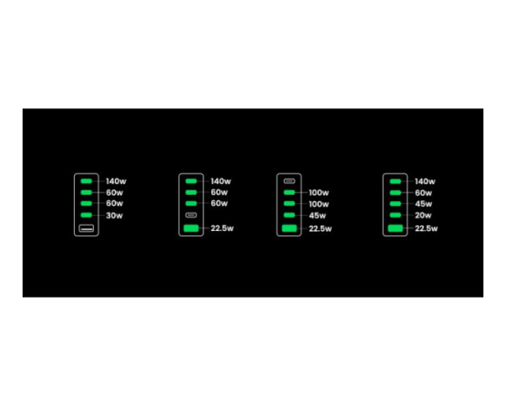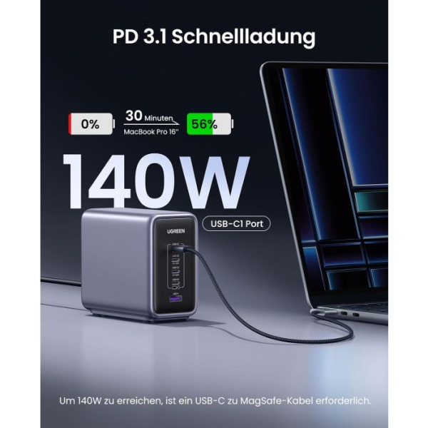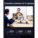inovativni 300 W polnilnik s hitrostjo polnjenja PD 3.1 podpira največ 140 W. Izhod na USB-C1 in lahko napolni MacBook Pro 2021 16 inch od 0 % do 56 % v 30 minutah. S hkratno uporabo USB C1 & C2 & C3 je mogoče doseči največjo moč 300 W (140 W + 100 W + 60 W).