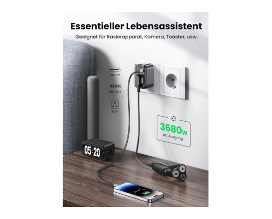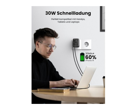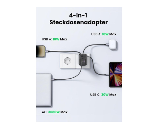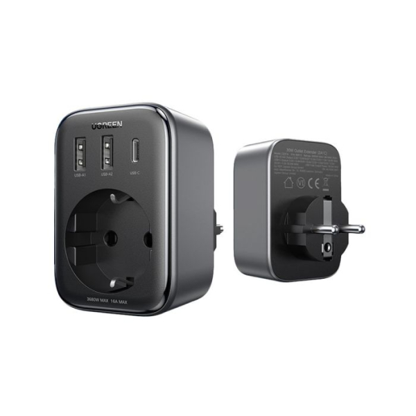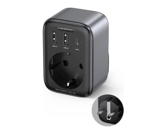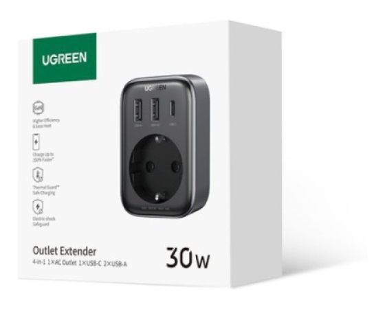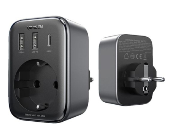 vtičnica UGREEN PD 30W USB C združuje 1 x AC vtičnico, 2 x vrata USB-A in 1 x vrata USB-C za hitro polnjenje.