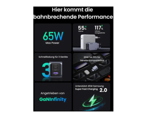 Polnilec s 65 W podpira Samsung Super Fast Charging 2.0 45 W in je združljiv s serijami MacBook, iPhone, Galaxy, Pixel, XPS, AirPods, Apple Watch, Steam Deck, Switch itd.