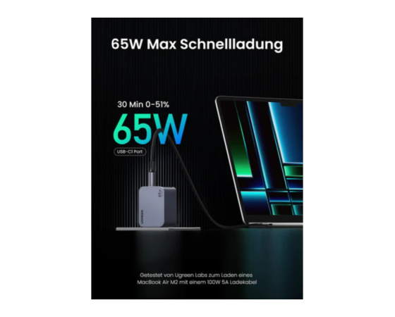 Z vrati USB-C1 lahko zagotovite učinkovito in izjemno hitro moč polnjenja največ 65 W, tako da lahko ta napajalnik s 65 W napolni vaš MacBook Air M2 od 0 % do 51 % v samo 30 minutah. Naredite vse hitro, mobilno in prilagodljivo.
