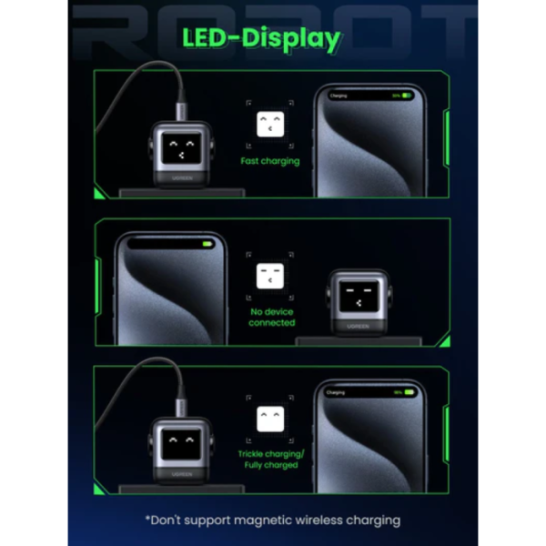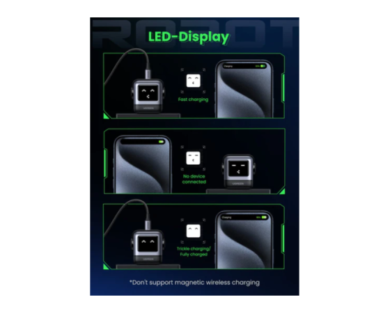 obraz robota je LED zaslon, ki prikazuje različne izraze za stanja polnjenja.