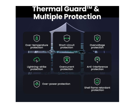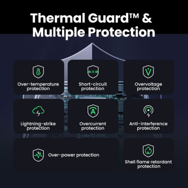 UGREEN zagotavlja maksimalno varnost uporabe, zato je polnilec Nexode Air opremljen s številnimi varovali. Zanesljivo ščitijo pred morebitnimi nevarnostmi, vključno s pregrevanjem, kratkimi stiki, preobremenitvijo, prevelikim tokom in čezmerno močjo. Poleg tega inteligentni sistem za upravljanje energije samodejno prilagodi moč polnjenja povezani napravi, da zagotovi še večjo zaščito.