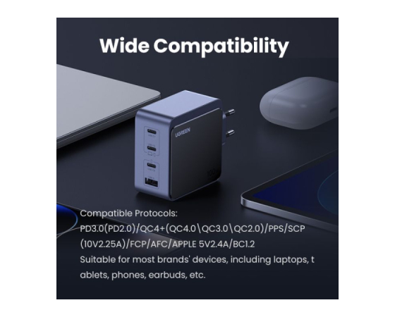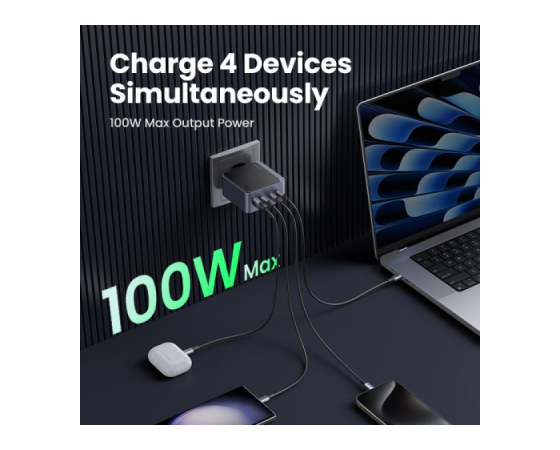 Pozabite na dolgo čakanje, da je vaša naprava pripravljena za uporabo! Polnilnik ponuja največjo moč do 100 W in podpira številne protokole hitrega polnjenja, vključno s QC, PD, AFC, PPS in Apple 5V/2.4A. Opremljen je tudi s 4 vhodi - 3x USB-C in USB-A, zahvaljujoč katerima lahko polnite do 4 naprave hkrati.