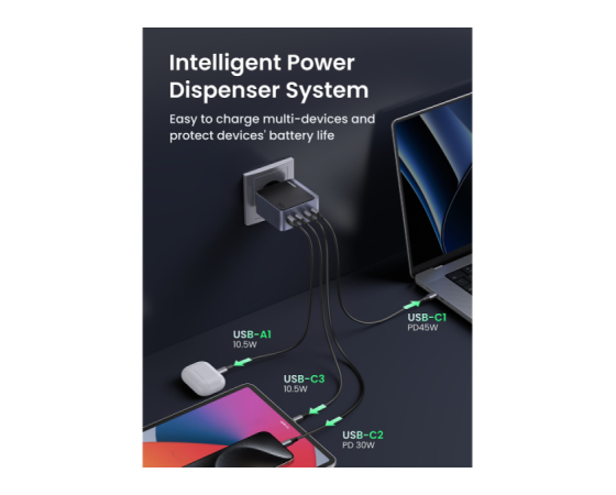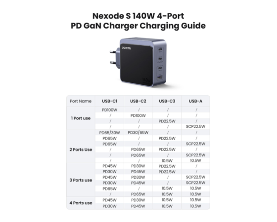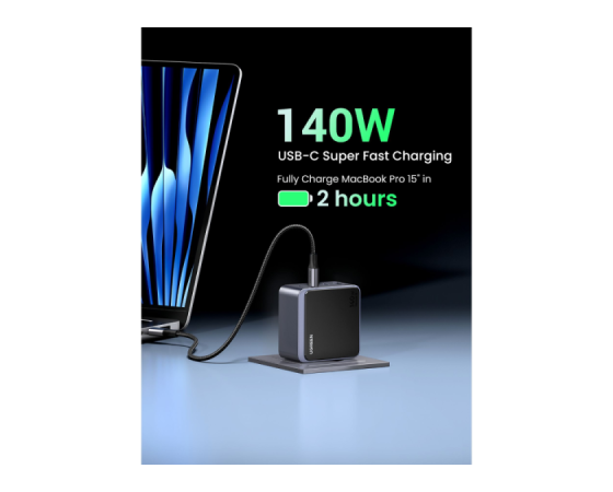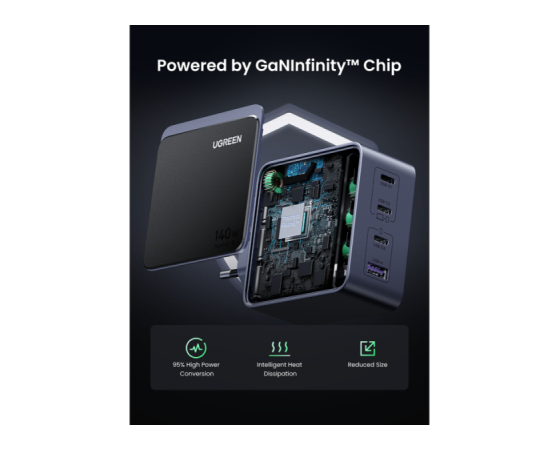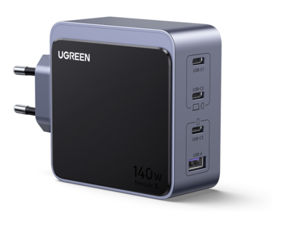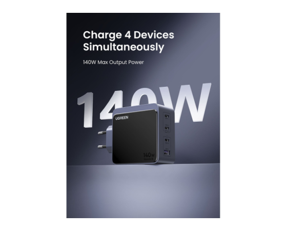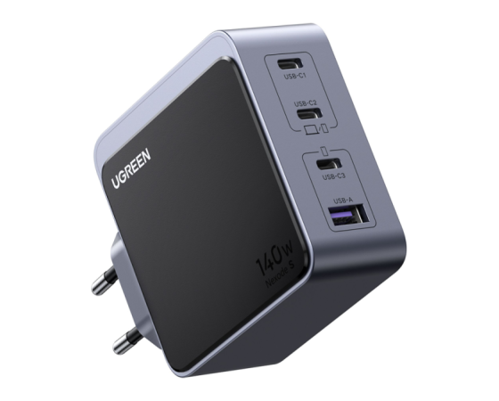 UGREEN 45575 je zmogljiv 140 W GaN polnilnik s štirimi izhodi, zasnovan za profesionalno uporabo in sodobna delovna okolja. Omogoča hkratno polnjenje prenosnikov, tablic in drugih USB-naprav z visoko skupno izhodno močjo ter učinkovito razporeditvijo energije med priključki. Zaradi GaN tehnologije polnilnik ohranja kompaktno obliko, visoko učinkovitost in stabilno delovanje tudi pri večjih obremenitvah.