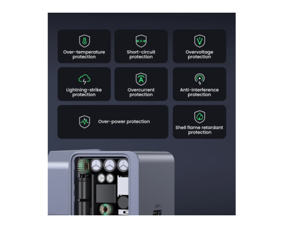 UGREEN zagotavlja maksimalno varnost uporabe, zato je polnilec Nexode Air opremljen s številnimi varovali. Zanesljivo ščitijo pred morebitnimi nevarnostmi, vključno s pregrevanjem, kratkimi stiki, preobremenitvijo, prevelikim tokom in čezmerno močjo. Tako ste lahko prepričani, da je vaša naprava v dobrih rokah!