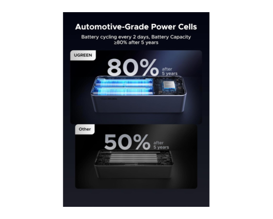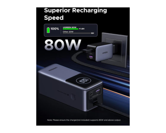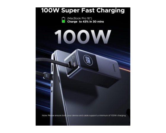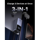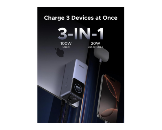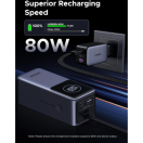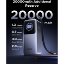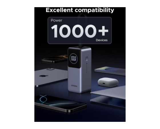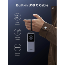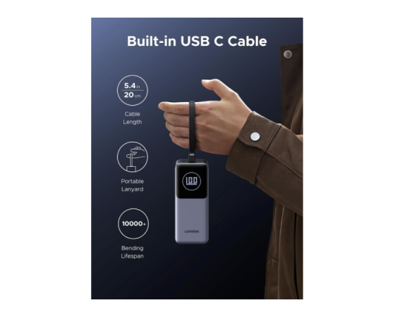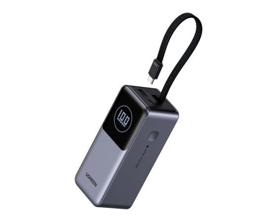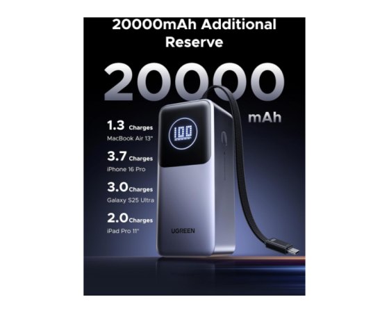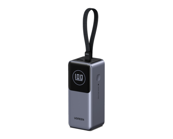 UGREEN 55365B je zmogljiv power bank s kapaciteto 20.000 mAh in skupno izhodno močjo do 130 W. Opremljen je z vgrajenim USB-C kablom ter dodatnima priključkoma USB-C in USB-A, kar omogoča hitro polnjenje prenosnikov, tablic in pametnih telefonov, kjerkoli ste.
