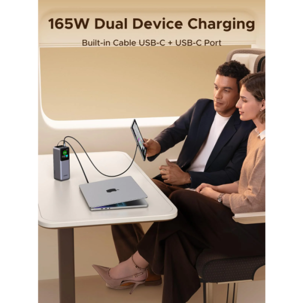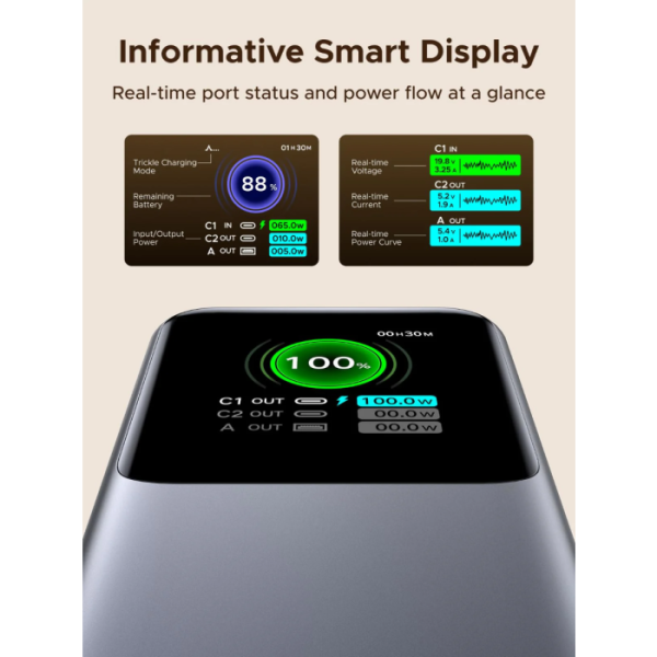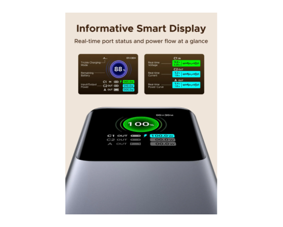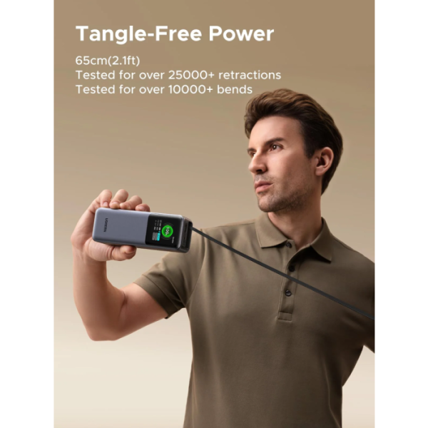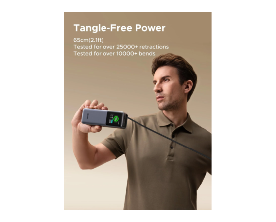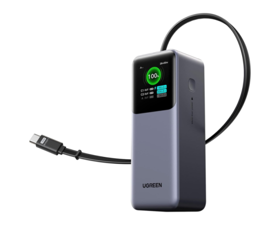 Vgrajen izvlečni USB-C kabel omogoča takojšnjo uporabo brez dodatnih kablov, napreden TFT zaslon pa zagotavlja jasen pregled nad stanjem baterije in porazdelitvijo moči.