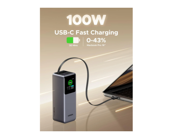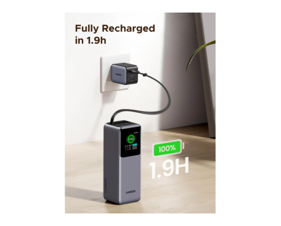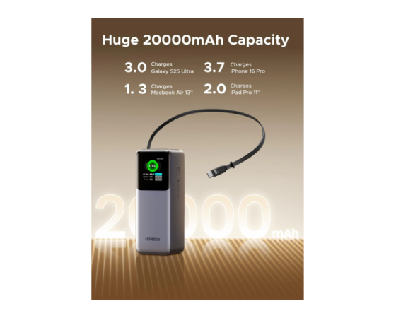 UGREEN 55987B je visoko zmogljiva prenosna baterija s kapaciteto 20.000 mAh, zasnovana za napajanje sodobnih prenosnikov, tablic in drugih zahtevnejših USB-naprav.