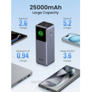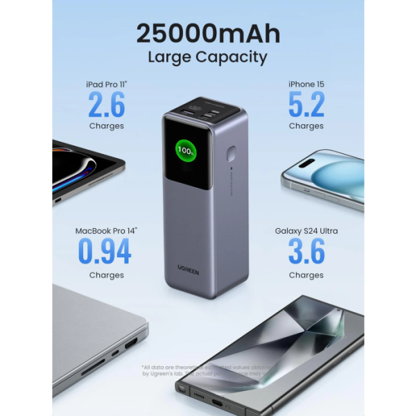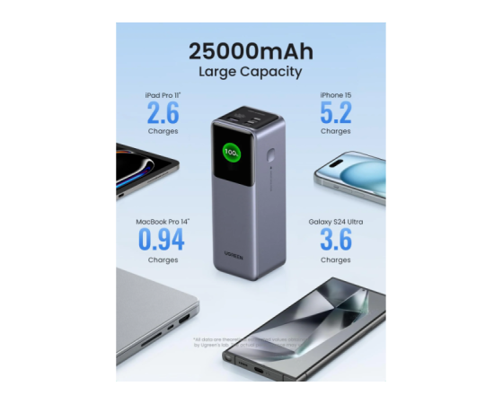 Napajalna banka UGREEN 25000 mAh zagotavlja neprekinjeno in zanesljivo napajanje, tako da popolnoma napolni MacBook Pro 16" do 1,3-krat, iPhone 15 do 5,2-krat in Galaxy S23 Ultra do 3,6-krat. Zmogljivost 90 Wh, ki jo odobrena iz strani letalskih družb, je idealna za ročno prtljago, da bo vaše potovanje po svetu polno energije.