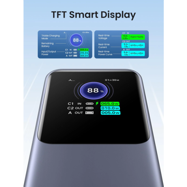 Zagotovite si pametnejšo izkušnjo polnjenja prek vrhunskega digitalnega zaslona, ​​ki prikazuje preostalo baterijo, napetost v realnem času, tok v realnem času, vhodno moč in izhodno moč. Hitro in intuitivno lahko razumete stanje napolnjenosti različnih naprav.