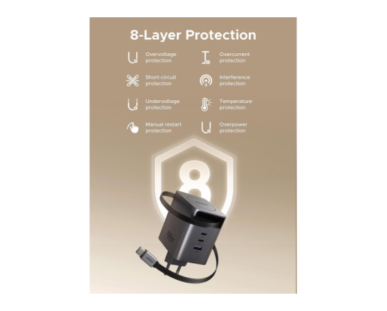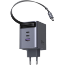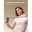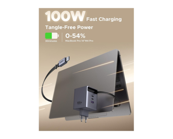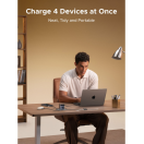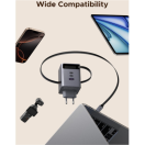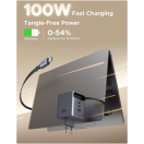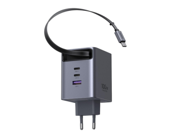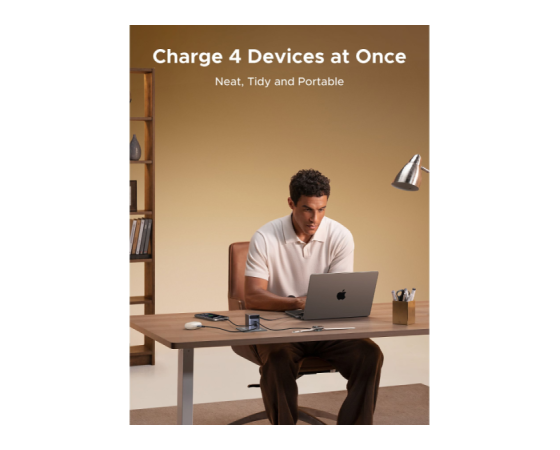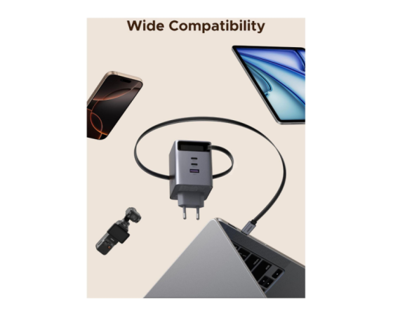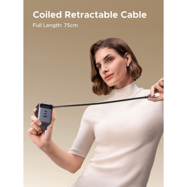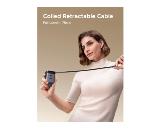 Polnilnik vključuje vgrajen izvlečni USB-C kabel dolžine 0,75 m, ki omogoča praktično uporabo brez dodatnih kablov. Poleg kabla ima še tri dodatne priključke (USB-C1, USB-C2 in USB-A), kar omogoča hkratno polnjenje več naprav.