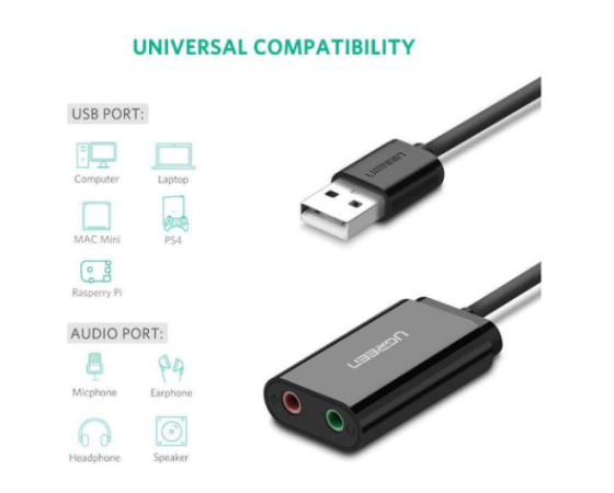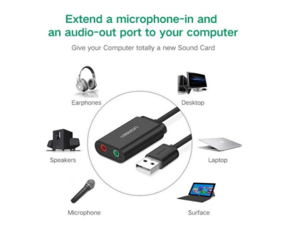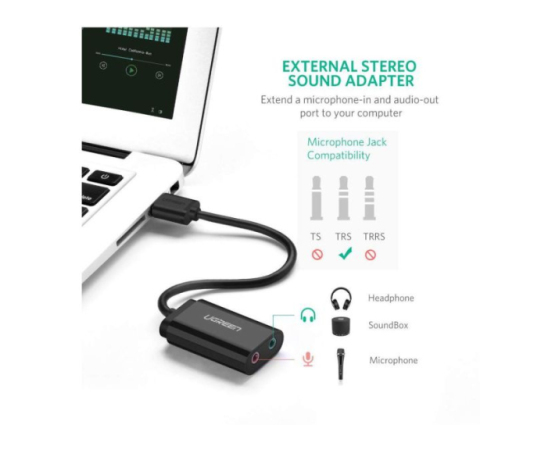 Ugreen USB Audio Adapter vključuje stereo izhod za slušalke in vhod za mono mikrofon. Lahko zaobide okvarjeno zvočno kartico ali napačna 3,5-milimetrska avdio vrata prenosnega / namiznega sistema in ponovno ustvari zvočno funkcijo za vas.