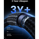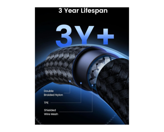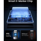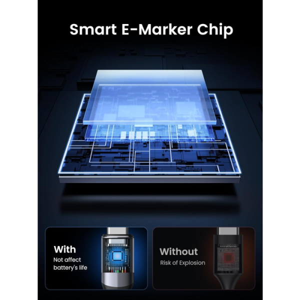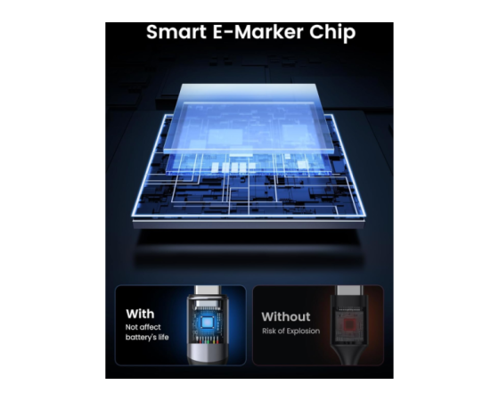 opremljen z inteligentnim čipom E-Marker za samodejno prilagajanje napetosti in toka, ki preprečuje prenapetost in previsok tok. Zaščiten s 4 plastmi zaščite, aluminijastim ohišjem in kovinsko prevlečenimi konektorji za izjemno hiter prenos podatkov, stabilno polnjenje in 4K UHD video.
