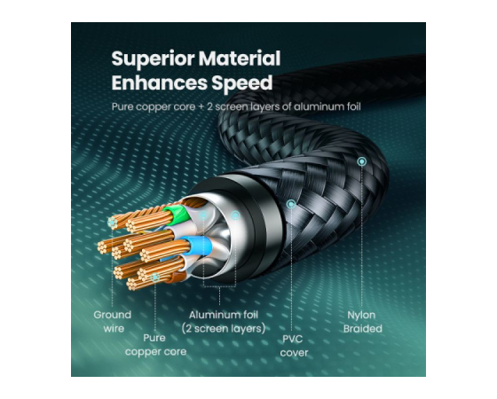 Ethernetni kabel UGREEN Cat 7 podpira prenos podatkov do 10 Gbps in pasovno širino 600 MHz, veliko hitreje kot CAT6 in z manj motenj. Je najboljša možnost za igranje iger, pretakanje spletnih videoposnetkov, prenos velikih datotek in drugo.