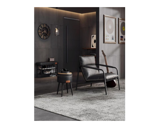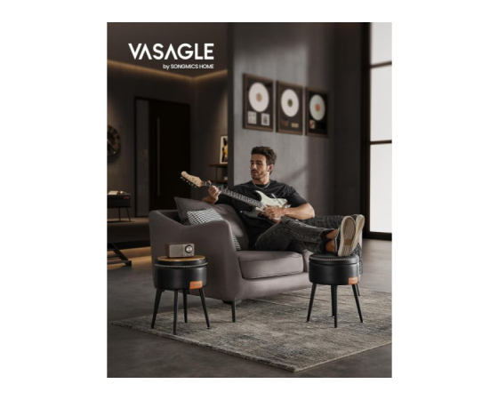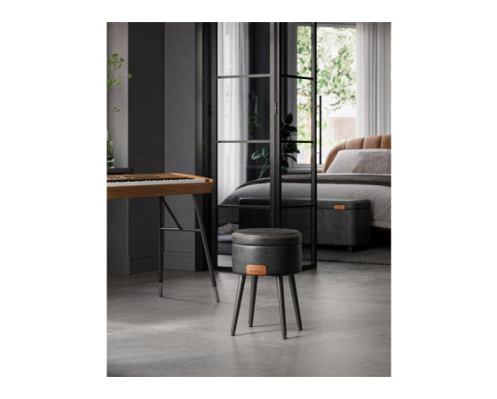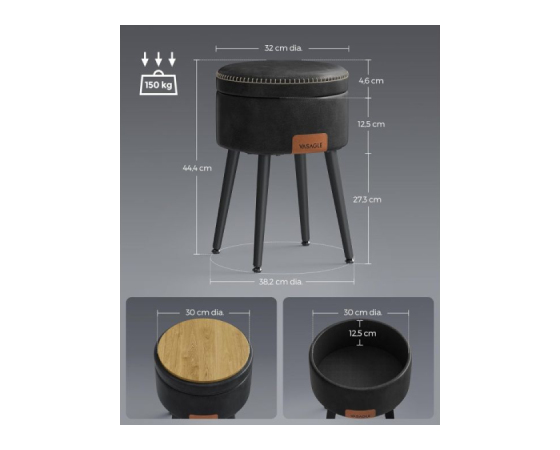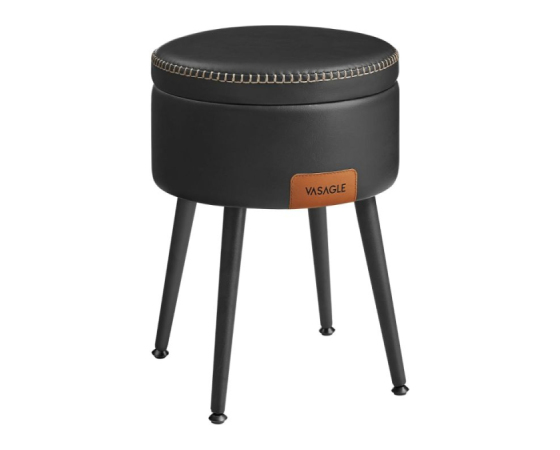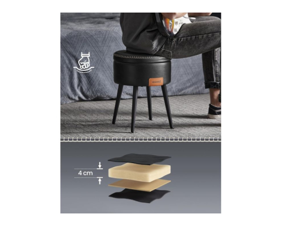 Eleganten in vsestranski, VASAGLE EKHO LOM005B01 združuje udobje s funkcionalnostjo. Tabure z oblazinjenim pokrovom iz črnega umetnega usnja z dekorativnim šivanjem zagotavlja udobno sedenje ali počitek stopal. Notranjost s prostornino približno 9,4 l omogoča shranjevanje drobnih predmetov, medtem ko štiri kovinske noge zagotavljajo stabilnost. Nizek okrogel dizajn se odlično poda k fotelju, pred toaletno mizico ali v dnevni prostor. Lahko se uporablja kot tabure, podnožnik ali stranski mizica.