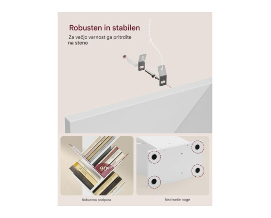 Stabilna in varna: Izdelana iz kakovostne iverne plošče in opremljena z napravo proti prevračanju za dodatno varnost – vsaka polica prenese do 10 kg.