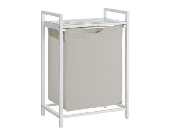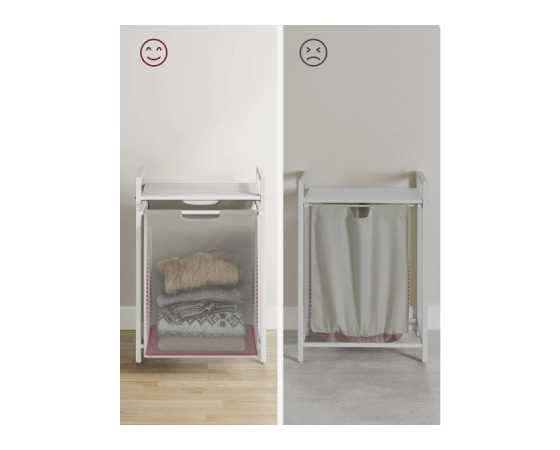 Letvena polica za shranjevanje: ta košara za perilo ima polico, ki zagotavlja dodaten prostor za organiziranje detergentov ali toaletnih potrebščin. Njegova zasnova z letvicami omogoča pretok zraka za dobro prezračevanje in preprečuje nabiranje vonjav v perilu.