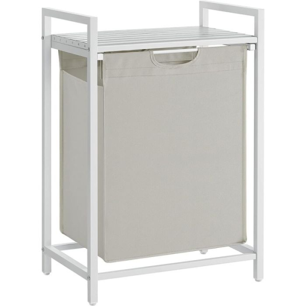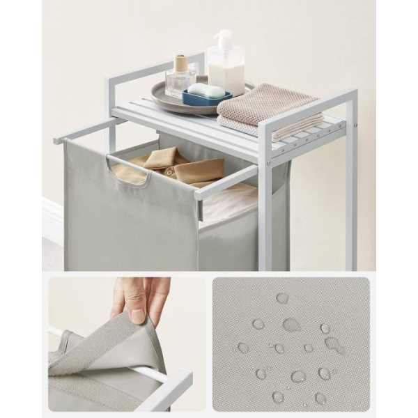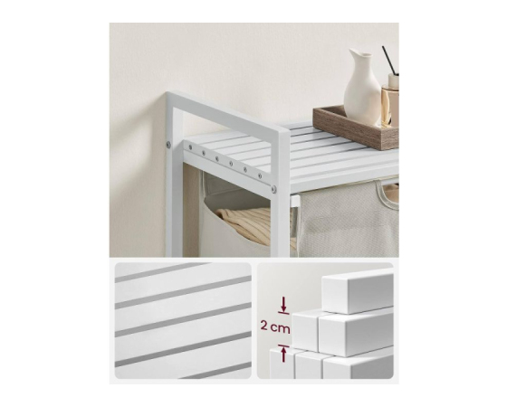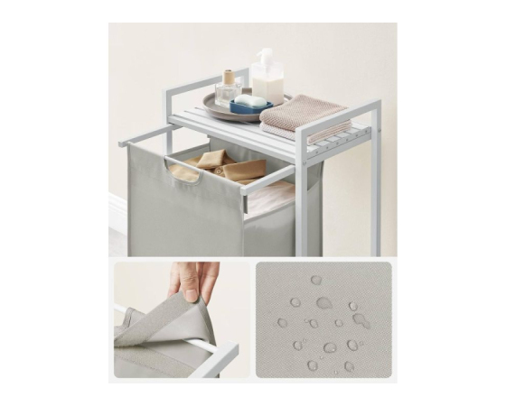 Trdna in stabilna: izdelana iz okvirja iz 2 cm jeklene cevi in plošče iz MDF, podpira do 20 kg na zgornji polici. Poleg tega je košara izdelana iz vodoodbojne tkanine Oxford, štiri nastavljive noge pa zagotavljajo stabilnost