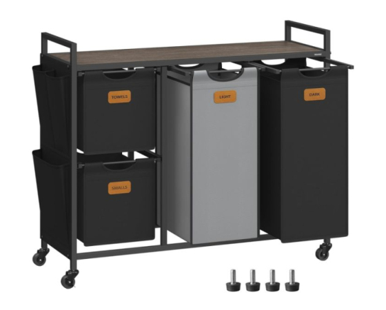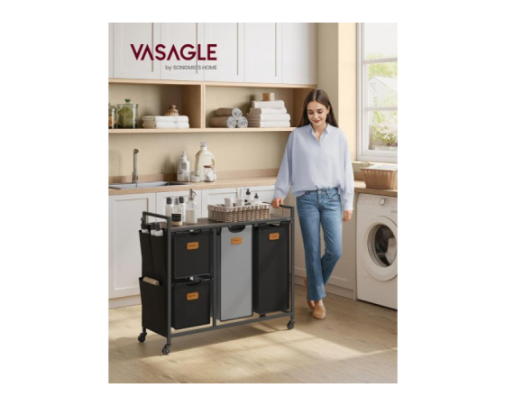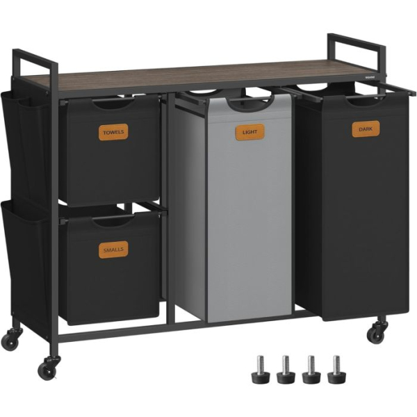VASAGLE koš za perilo s 4 predali, 150 L sortirnik perila, premični voziček s policami, odstranljivimi vrečami, 6 etiketami, kostanjevo rjava, črnilo črna in sivo golobja