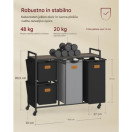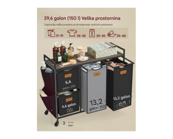 Veliko prostora za shranjevanje: Ta voziček za perilo vključuje dve košari po 25 L in dve košari po 50 L, skupaj s prostorom za 150 L perila. 3 police nudijo prostor za detergent, vrečke za pranje in še več. Vse ima svoj prostor.