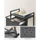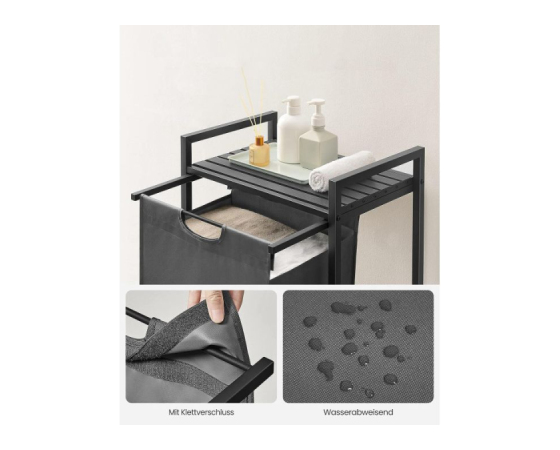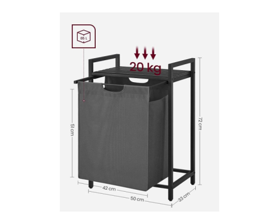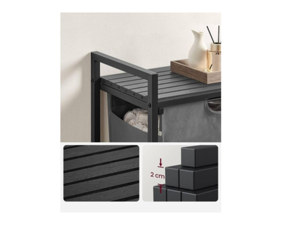 Trdna in stabilna: izdelana iz okvirja iz 2 cm jeklene cevi in plošče iz MDF, podpira do 20 kg na zgornji polici. Poleg tega je košara izdelana iz vodoodbojne tkanine Oxford, štiri nastavljive noge pa zagotavljajo stabilnost