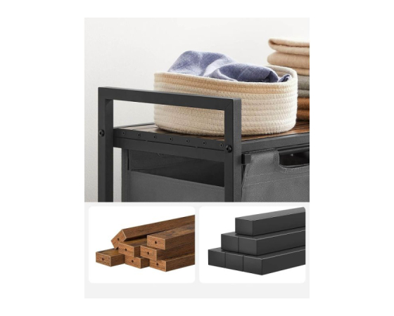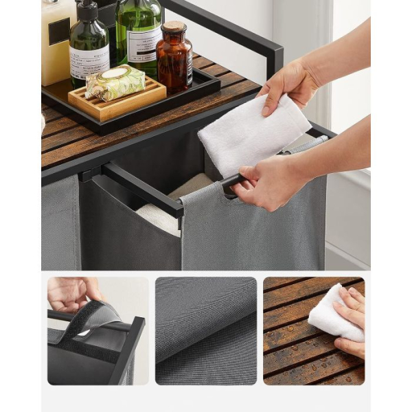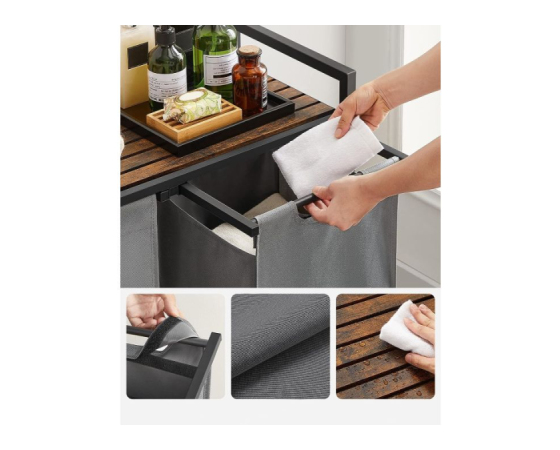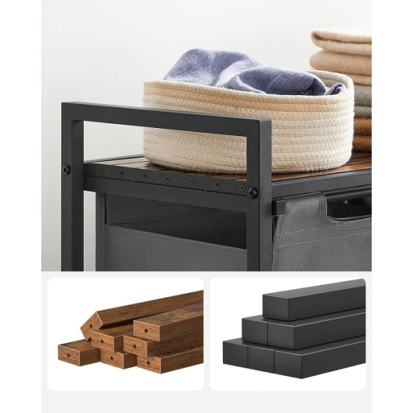 Trdna in stabilna: izdelana iz okvirja iz jeklene cevi debeline 2 cm in plošče iz MDF-ja, ta koš za perilo zdrži do 20 kg na zgornji polici. Poleg tega je vsaka podloga izdelana iz vodoodbojne tkanine Oxford, štiri nastavljive noge pa zagotavljajo stabilnost