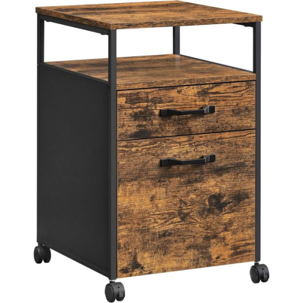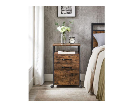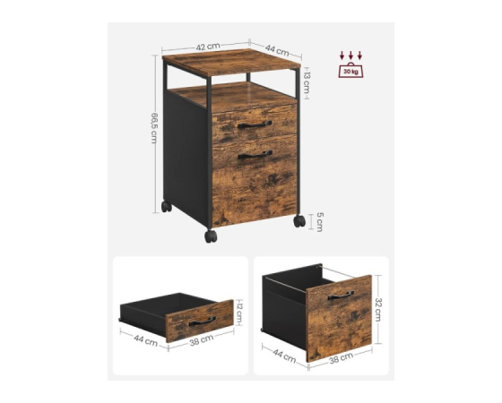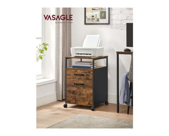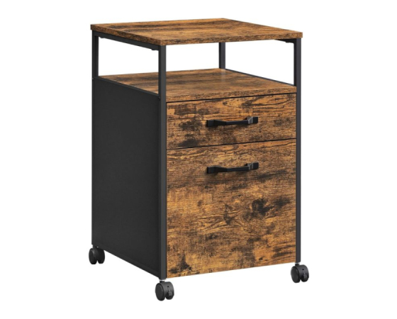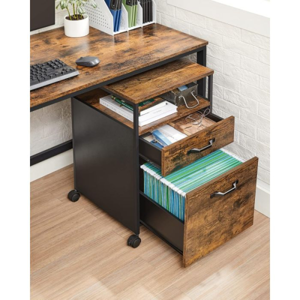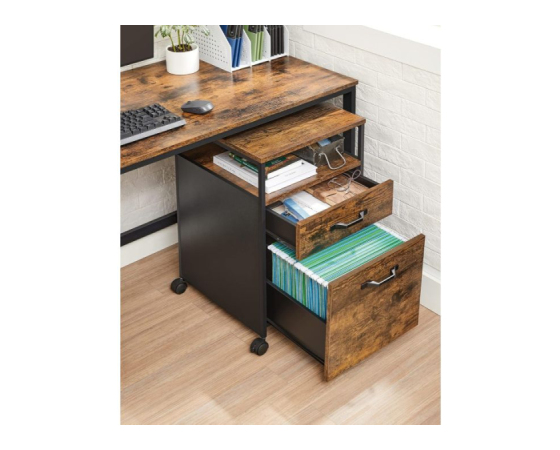 Uredite svojo delovno mizo z več stila! VASAGLE premični predalnik v kombinaciji rustikalnega lesa in črne kovine prinaša industrijski pridih, ki se lepo poda tako v sodobno pisarno kot domač kotiček. S tremi prostornimi predali lahko shranite pisarniške pripomočke, dokumente ali osebne stvari, medtem ko štiri kolesca (dve z zavoro) omogočajo enostavno premikanje in stabilnost. Robustna jeklena konstrukcija in kakovostna iverna plošča zagotavljata trpežnost, kompaktna širina pa omogoča, da predalnik enostavno zdrsne pod pisalno mizo.
