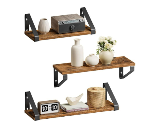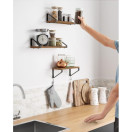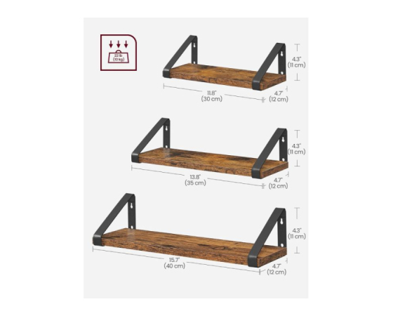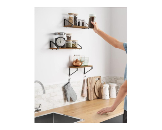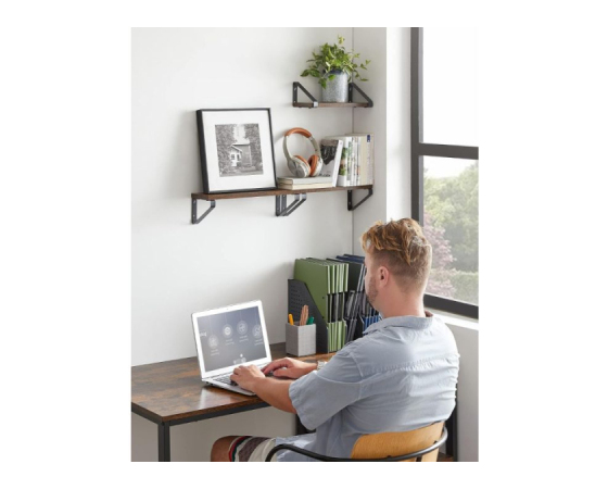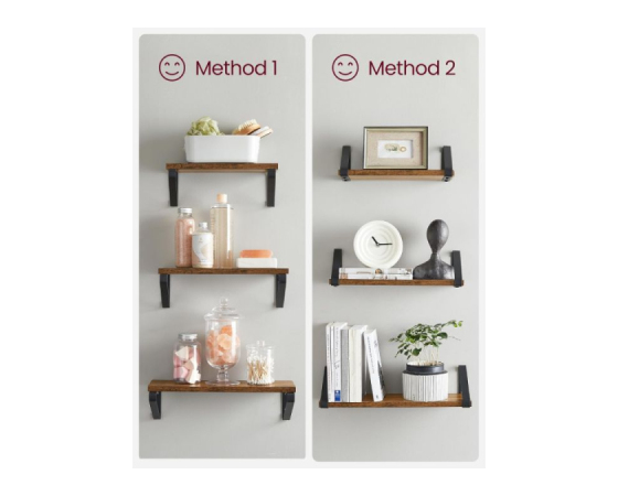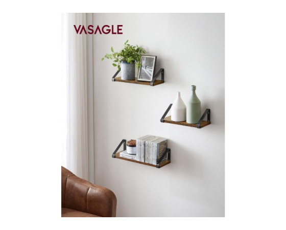 Popestrite svoj prostor z vsestranskimi plavajočimi policami VASAGLE, ki združujejo rustikalni šarm lesa in robustnost črnega kovinskega okvirja. Komplet dveh stenskih polic je idealen za kopalnico, kuhinjo, dnevno sobo ali spalnico – za razstavljanje okrasnih predmetov, knjig, toaletnih pripomočkov ali začimb. Vsaka polica ima dvignjen kovinski rob, ki preprečuje padce predmetov, in praktične nosilce, ki omogočajo tudi obešanje brisač ali kuhinjskih pripomočkov. Zahvaljujoč preprosti montaži in kompaktnemu dizajnu sta polici odličen način za izkoristek prazne stene in dodajanje industrijskega značaja prostoru.