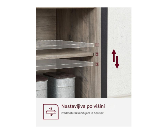 Število polic: 2 zaprti omari (vsaka z nastavljivo polico) + 1 odprta sredinska polica