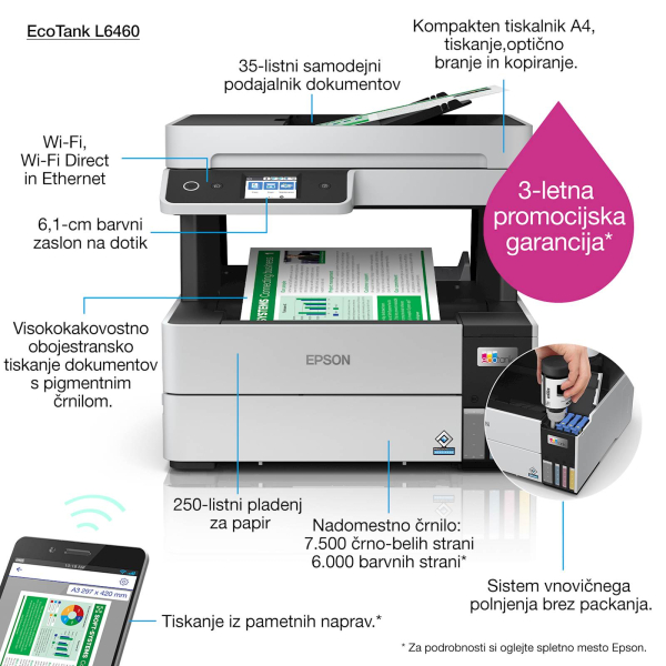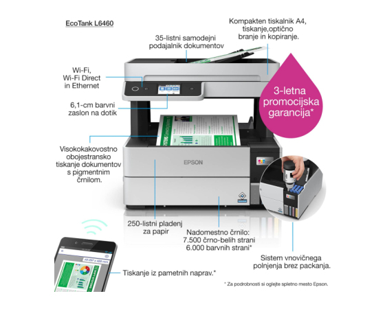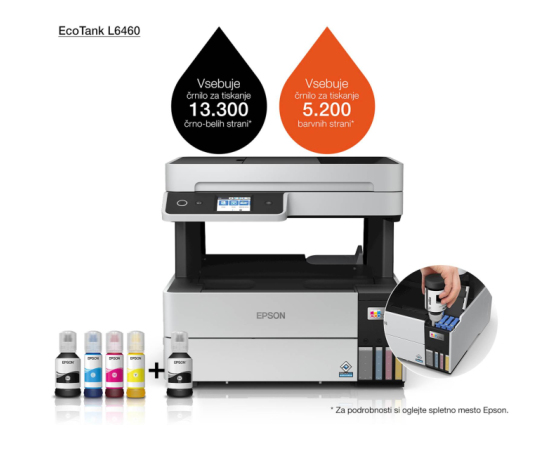 Priložena črnila: Bk (pigment) za 13.300 strani in CMY (pigment) za 5.200 strani