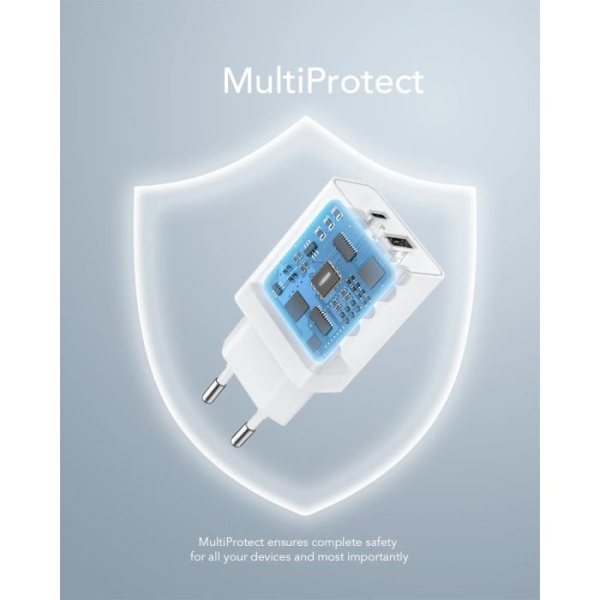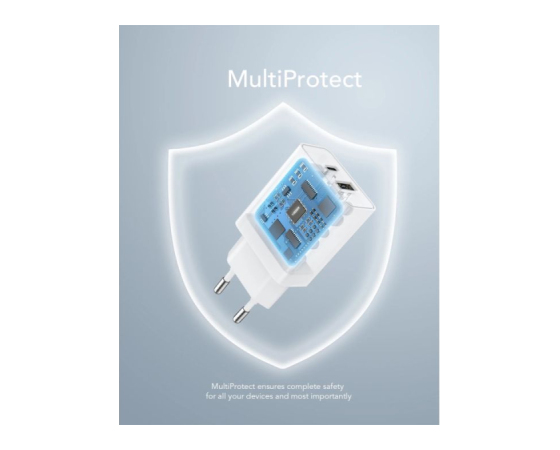 Zasnova z dvojnimi prikljčki (1 vrata USB-C Power Delivery in 1 vrata USB-A) vam omogoča hitro polnjenje telefona in tablice hkrati, kadarkoli in kjer koli.
