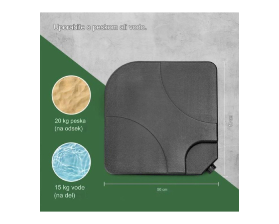 Vsak del podlage lahko napolnite s 15 kg vode ali 20 kg peska, kar omogoča prilagoditev teže glede na vaše potrebe in vremenske razmere. Tako bo vaš senčnik vedno stabilno postavljen, ne glede na okoliščine.