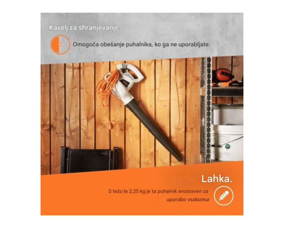 Ko puhalnika ne uporabljate, lahko cev hitro odstranite ali ponovno namestite s pomočjo sistema hitrega vpenjanja. Odstranite cev in uporabite kavelj za shranjevanje, da se puhalnik prilagodi razpoložljivemu prostoru. Idealna rešitev za manjše in polne vrtne lope.