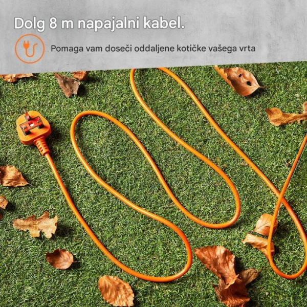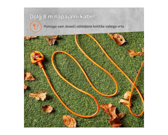 Ergonomsko oblikovan ročaj in teža le 2,25 kg omogočata udobno uporabo brez napora. Dodatno prednost predstavlja dolg 8 m napajalni kabel, ki omogoča enostaven dostop do celotnega zunanjega prostora, od terase do robov vrta.