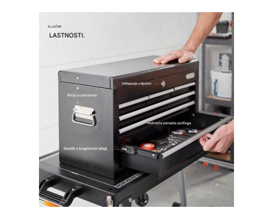 Ko orodje ni v uporabi, je mogoče predale varno zakleniti z zaklepno palico in ključem (priložena 2 ključa).