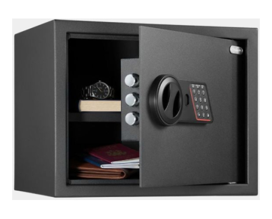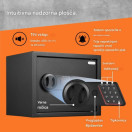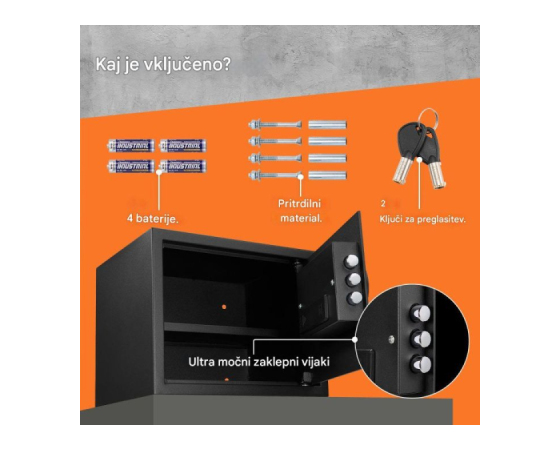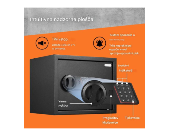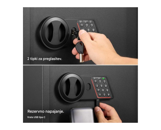 Zaščitite svoje stvari s prilagodljivim geslom dolžine od 3 do 8 številk. Sef je opremljen s samodejnim zaklepanjem, ki se aktivira po več zaporednih napačnih vnosih. Če geslo kdaj pozabite, sta na voljo dva varnostna (rezervna) ključa za hiter dostop – brez stresa in brez zapletov.