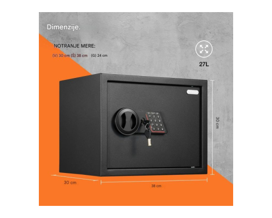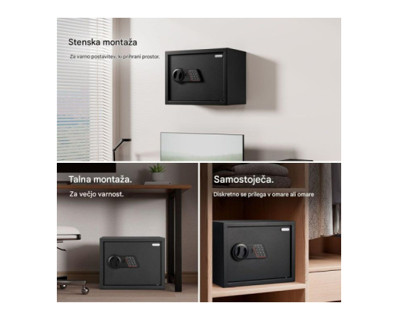 Priloženi so robustni montažni elementi za pritrditev na steno ali tla, zato je sef trpežen in vsestranski. S priročno prostornino 27 litrov in vgrajeno polico lahko shranite veliko dragocenosti, ne da bi zavzel preveč prostora – popolna izbira za stanovanja, hiše ali pisarne.