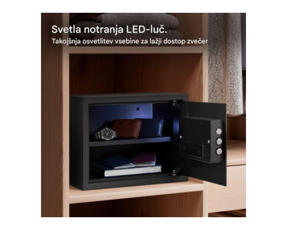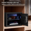 Želite tih dostop? Aktivirajte tihi način (mute) za neslišen vnos kode in diskreten dostop brez pritegovanja pozornosti. Notranja LED-luč pa poskrbi, da boste svoje predmete zlahka našli tudi ponoči.