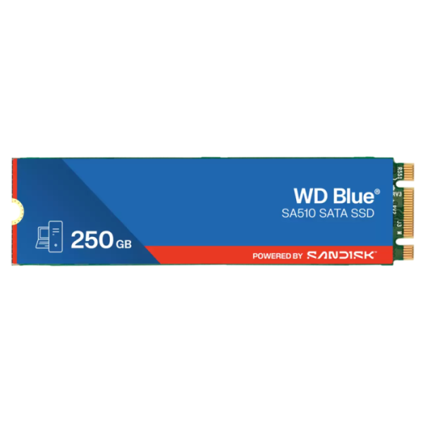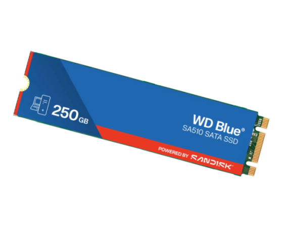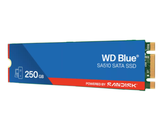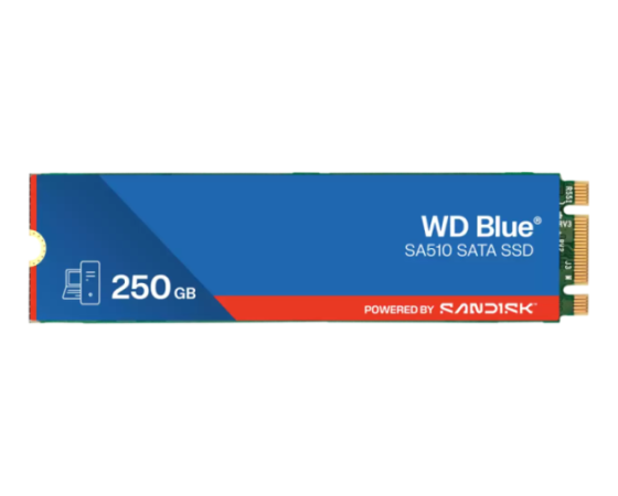 SanDisk WDS250G3B0B (Blue SA510) je M.2 2280 SSD z 250 GB kapacitete in namenjen za nadgradnjo namiznih in prenosnih računalnikov. Deluje preko SATA 6 Gb/s in dosega sekvenčne hitrosti branja do 555 MB/s ter pisanja do 440 MB/s. Naključne operacije znašajo do 80 000 IOPS pri branju in 78 000 IOPS pri pisanju. Vzdržljivost znaša 100 TBW, MTTF pa do 1,75 milijona ur. Podpira 5‑letno garancijo in vključuje Acronis True Image ter SanDisk SSD Dashboard za zaščito in spremljanje stanja diska.