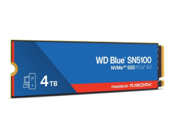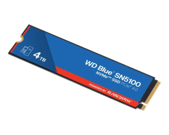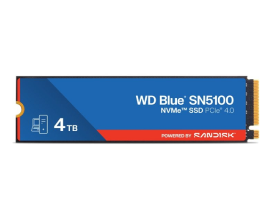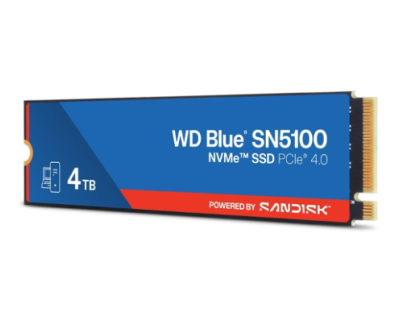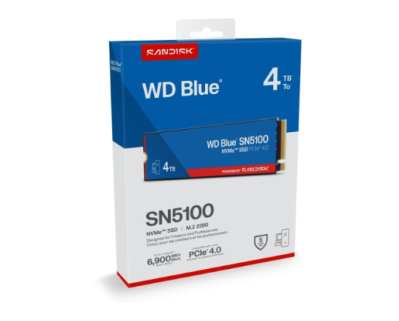 SanDisk WD Blue SN5100 4 TB (model WDS400T5B0E) ponuja kapaciteto 4 TB v formatu M.2 2280 ter uporablja vmesnik PCIe Gen 4.0×4 (NVMe), kar omogoča izjemno hiter prenos podatkov in odziven čas. SSD uporablja napredno 3D CBA QLC NAND tehnologijo, vključuje tehnologijo nCache 4.0 za optimizacijo delovanja ter zagotavlja velike hitrosti in učinkovitost pri urejanju videa, ustvarjanju vsebin ali kot sistemski pogon. Zasnovan je za široko uporabniško okolje – od osebnih računalnikov do profesionalnih sistemov, kjer je ključna zmogljivost in zanesljivost.