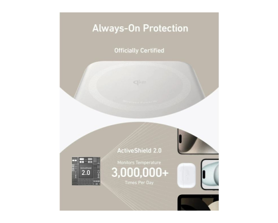 Sprejmite udobje brezžičnega polnjenja s 15 W, ki je opremljeno z zagotovilom certifikata Qi2 za hitro, varno in učinkovito povečanje moči.