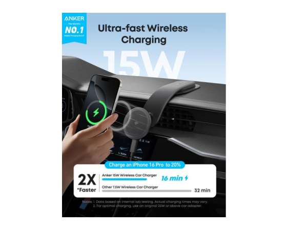 Hitro 15 W brezžično polnjenje Priklopite telefon na magnetni avtomobilski polnilnik in uživajte v hitrem 15 W brezžičnem polnjenju. iPhone 16 Pro napolnite do 20 % v samo 16 minutah.