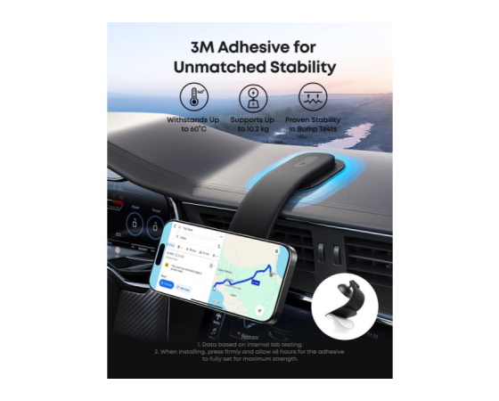 Stabilen oprijem tudi na zahtevnih cestah Magnetna sila 16 N zagotavlja stabilen in varen oprijem telefona tudi na zelo razgibanih cestah. Avtomobilski 3M lepilni trak nudi močno in dolgotrajno vez, ki preprečuje, da bi se nosilec odlepil.